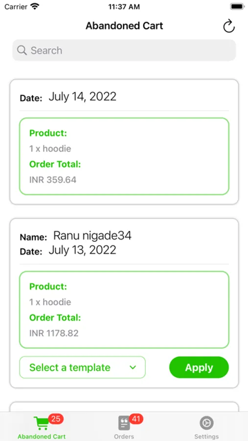 3. Once you login, you will see there are three main tabs at the bottom. Abandoned Cart, All Orders, and Settings. By default, you will see the "All Orders" tab, which will contain all the order information.