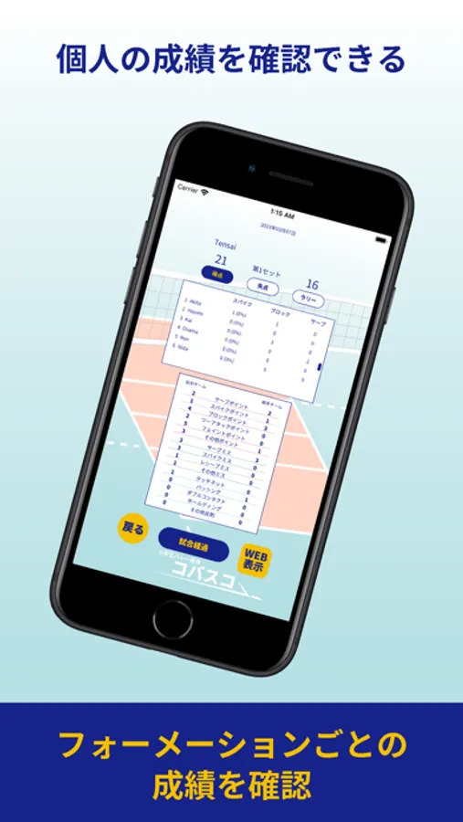 試合の流れや、個人・フォーメーションごとの成績を確認できます。