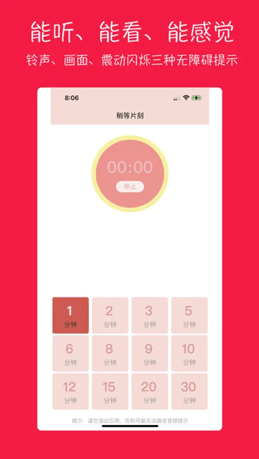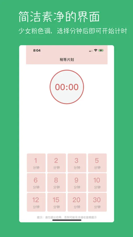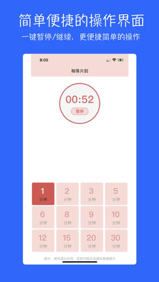 一款便捷操作的轻闹钟,可以快捷设置在多少分钟后提醒,不仅有语音提醒还有闪烁画面提醒,兼顾聋哑人朋友的提醒通知