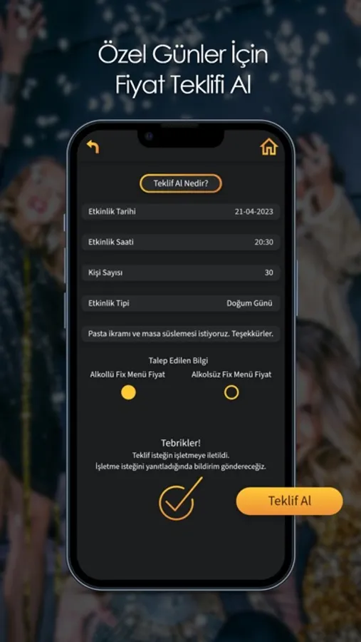 Doğum günü, kutlama, toplantı gibi etkinlikler için işletmelerden fiyat teklifi al, teklifleri karşılaştır.