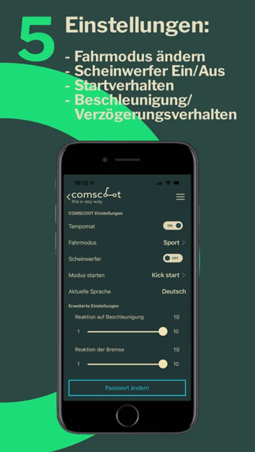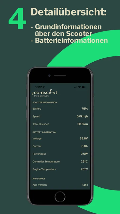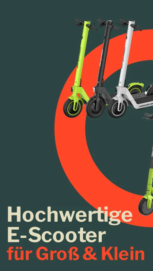 Die kostenlose comscoot App ist die ideale Ergänzung für unterwegs. Ein innovativer E-Scooter trifft auf technisches Gadget. Stellen Sie ganz bequem die Beschleunigungs- und Verzögerungswerte auf Ihre Bedürfnisse ein, damit Sie Ihre Fahrt voll und ganz genießen können. Zusätzlich verfügen die ComScooter über eine Tempomatfunktion und verschiedenen Fahrstufen - allesamt in der App konfigurierbar.