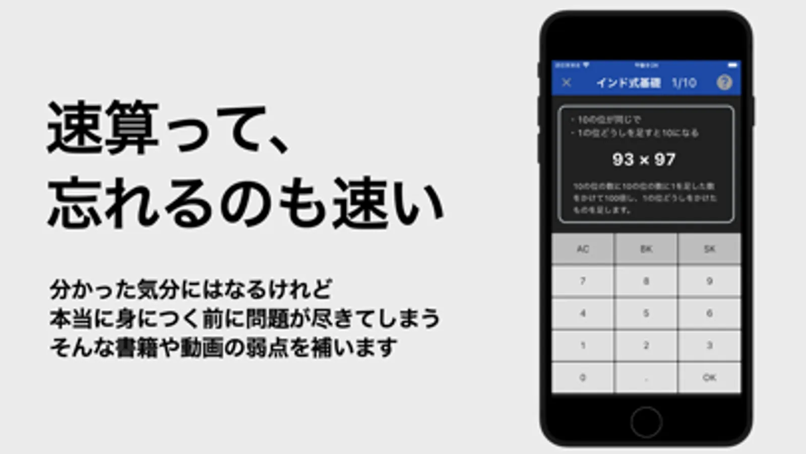 人は人生でどれだけの計算をするのでしょうか?計算が速い、間違いが少ないというのは、地味ではあるけれど他のどんな能力にも劣らないくらい生きることを楽にします。このアプリはインド式計算法をはじめとした覚えにくく忘れやすいさまざまな速算法を身につけ忘れずにとどめておく事を補助します。