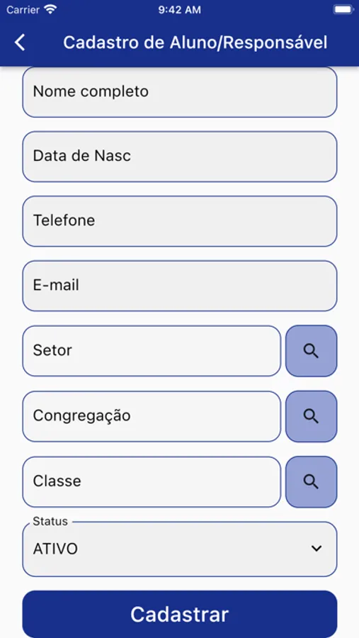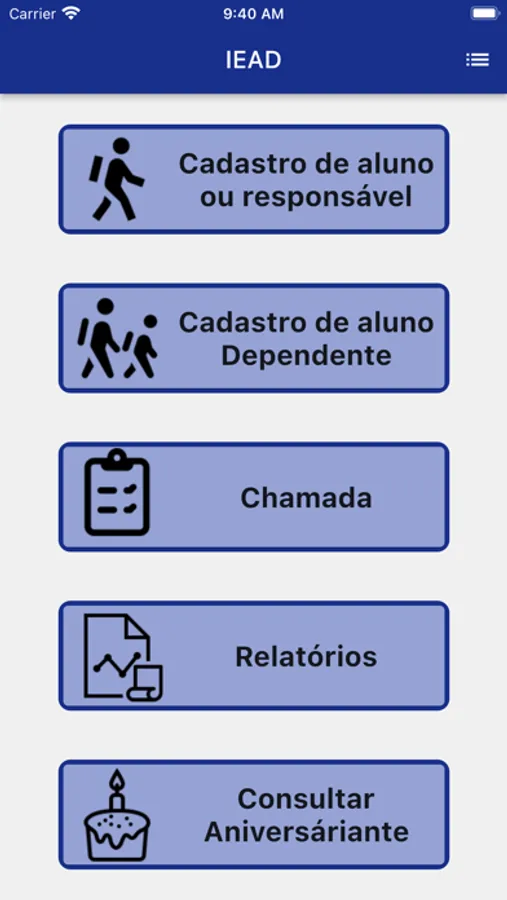 Cadastro de Aluno/Responsável, relatórios, lista de presença.