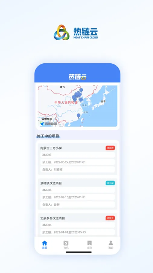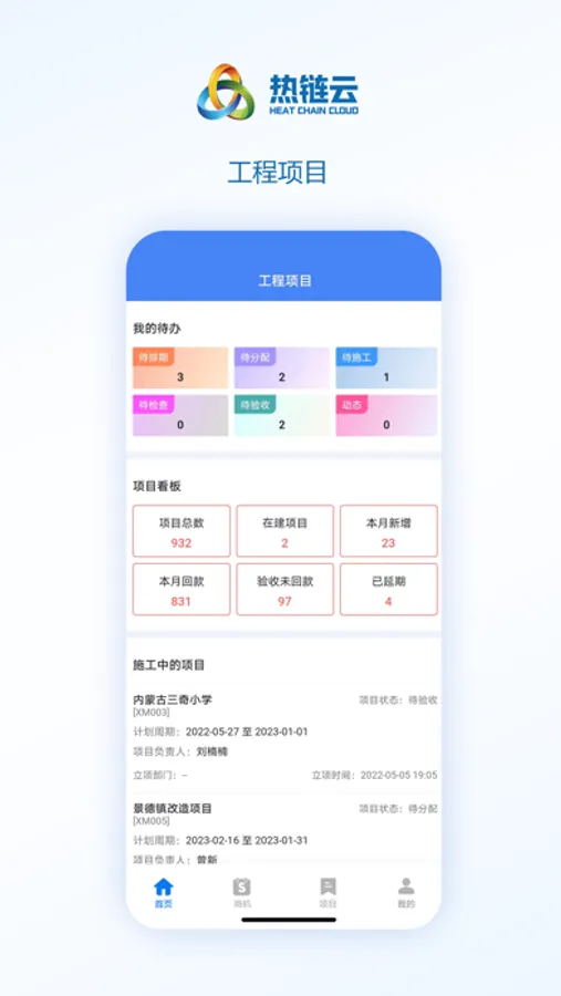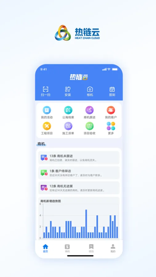 App用于能源设备行业(比如空气源热泵和空调等生产企业、代理商、经销商等),构建从营销、销售、工程、运行到售后服务的流程管理,例如项目进度管理、库存管理、商机管理等。