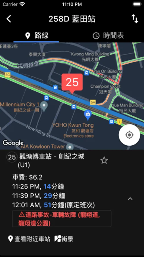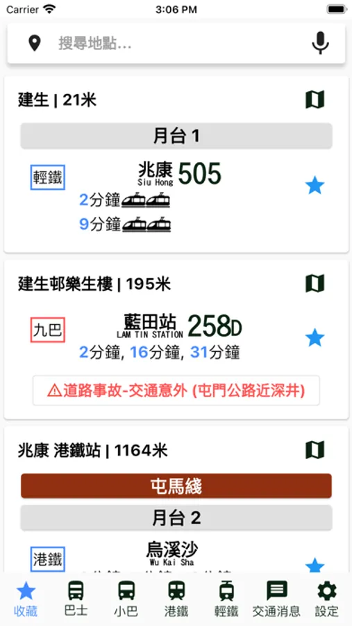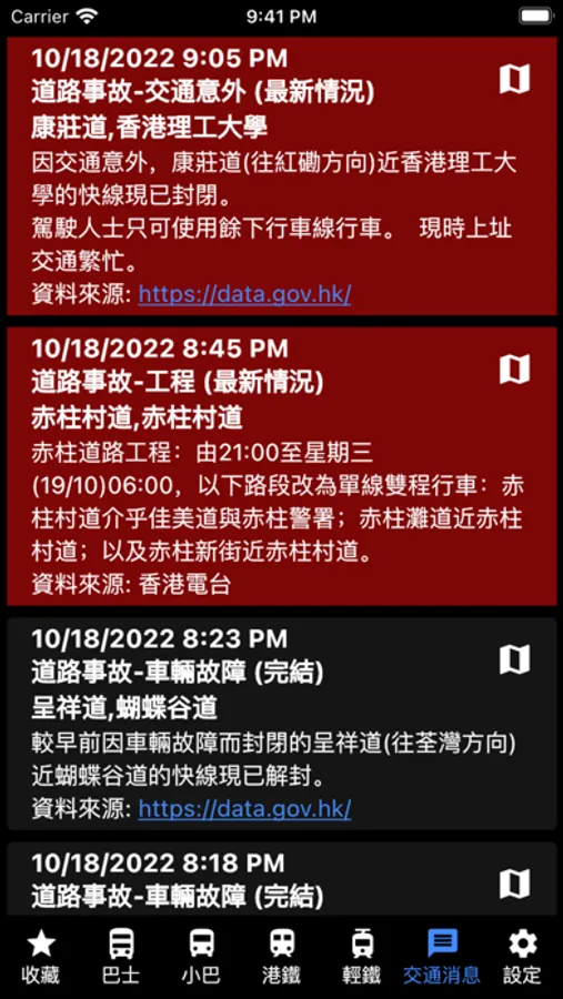 Receive the latest traffic information and check the arrival time of buses, minibuses, light rail and MTR. With big data processing and map analysis, traffic incidents and affected routes can be analyzed in seconds. The latest message can be pushed accorading to the route favorited by the user.