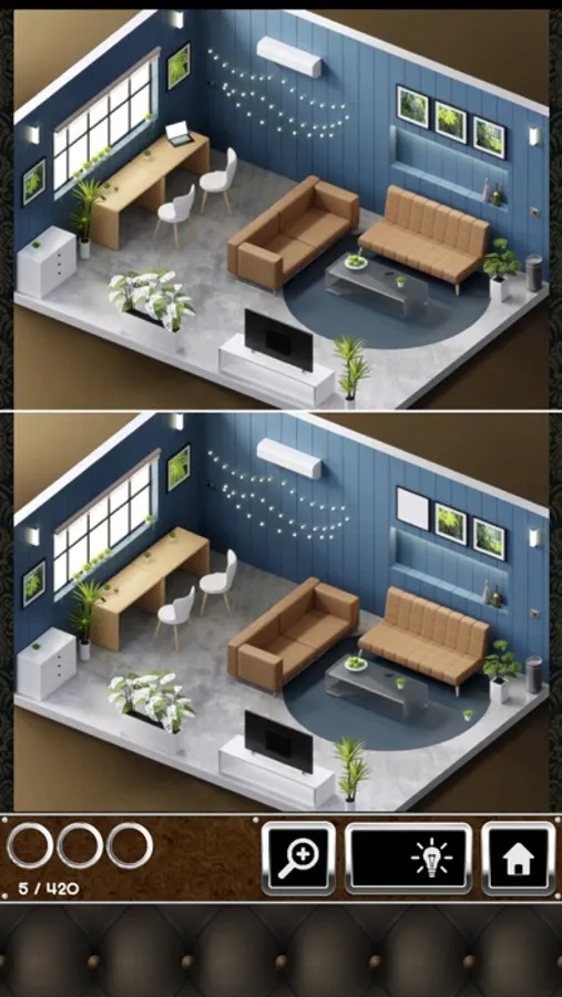 Challenge your detective skills in an interior setting while playing this find the difference game where you have to find the difference between two photos. All photos are of a unique interior setting to give this game a detective theme. You have to spot differences in an interior setting as the challenge tests your detective skills in this difference game.