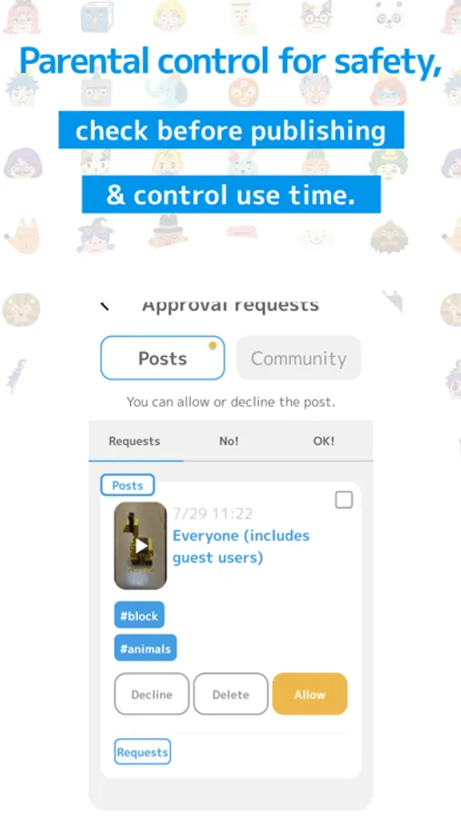 The parental control function allows guardians to set rules tailored to each family, such as whether parental confirmation is required before a post is published, restrictions on children's comments, followers, time of usage, and community participation. Settings can be tailored to suit the age and development of the child and each family's educational policy. For example, upper elementary school students can be given more autonomy, lower elementary school students can be set to require parental confirmation.