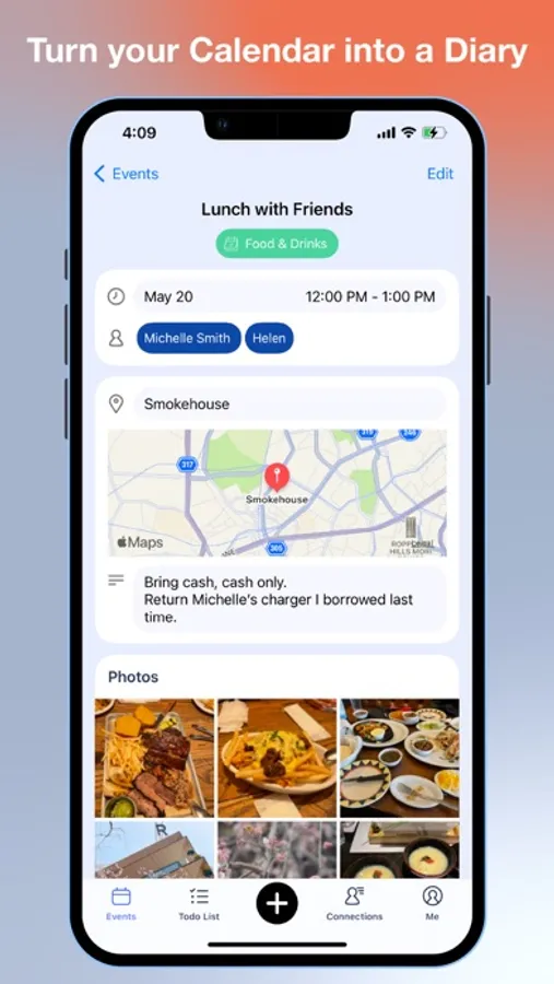 Tag friends, add photos, memos, location, so your calendar becomes a diary of your life!