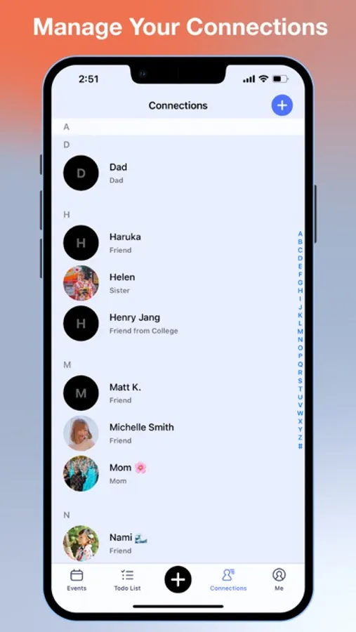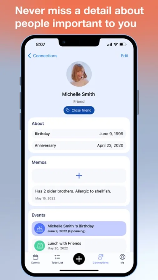 Our busy schedule and overwhelming social media can often make us forget about people important to us. Nami helps you remember everything about them, and easily search for events that you attended with them. Your connections and memory with family and close friends, all at a glance!