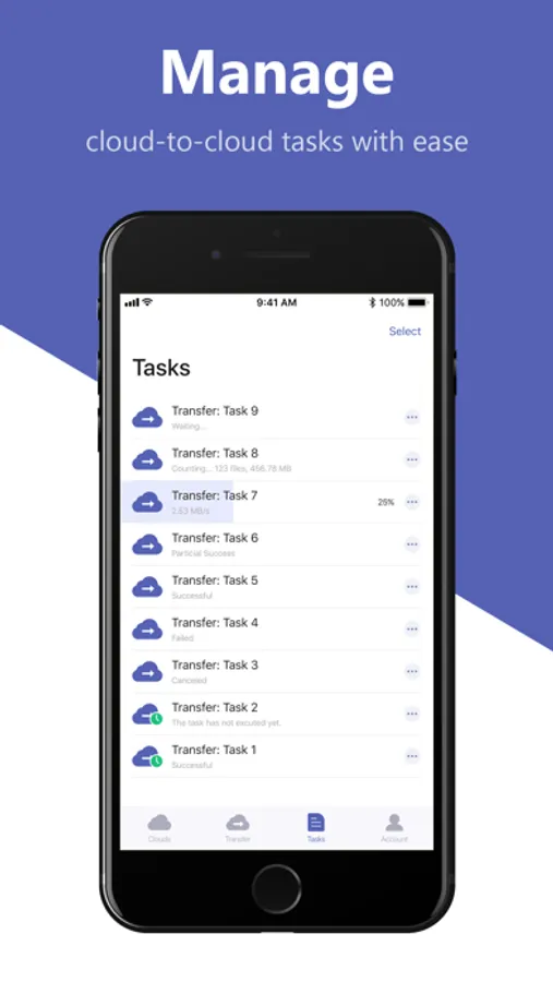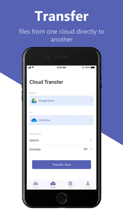 Directly Transfer files from one cloud service to another without going through your device, e.g., transferring files from Dropbox to Google Drive or migrating Google Workspace accounts to OneDrive for Business. Just select the two cloud services and start a transfer, everything you wanted to transfer is queued up and you’re all set. After a short while, you’ll see the files in the target cloud.