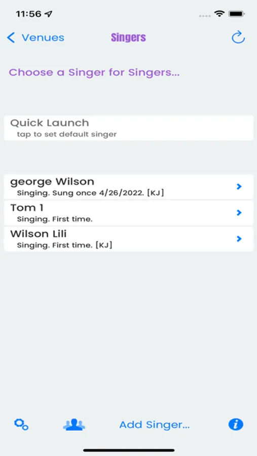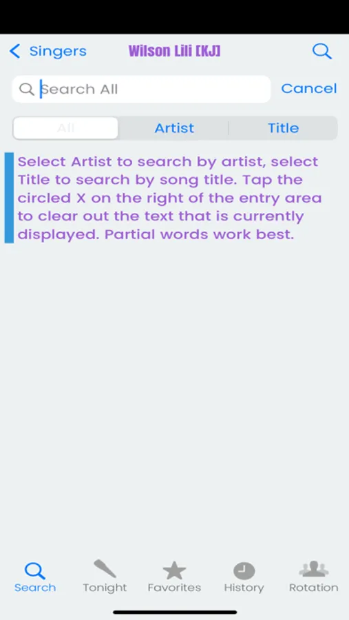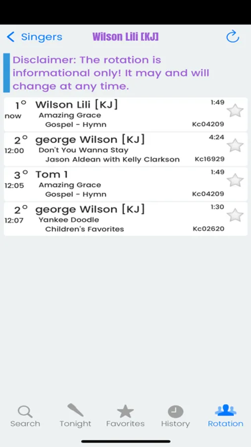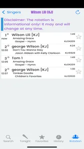 Singers can connect to kJams running on the KJ computer, search for songs, manage their queues (Tonight, Favorites, History), view the current Rotation, and change keys for their songs!