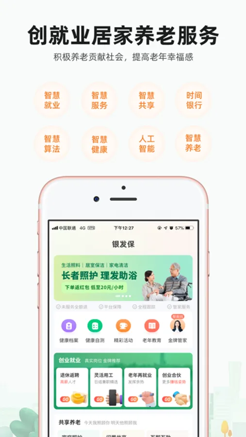 银发保,解决居家养老服务最后一公里。以老人为对象的精准化营销落地,以平台为支撑的多维度管理流程,以智能为应用的移动式运营体验。是集服务、营销、管理、运营于一体的智慧养老平台,运用互联网、移动互联网、物联网“三网”融合技术,整合优质养老资源,建z立一站式智慧服务体系;通过金牌管家将优质的产品和服务,传递给所需要的老人;通过平台智能互联,动态掌握老人的生活、健康、安全等状况,让老人、医生、管家、服务商之间不再有“距离”,构建居家智慧养老生态。