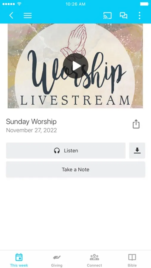 This app will help you stay connected with the day-to-day life of our church. With this app you can: watch or listen to past messages; stay up to date with push notifications; share your favorite messages via Twitter, Facebook, or email; and download messages for offline listening.