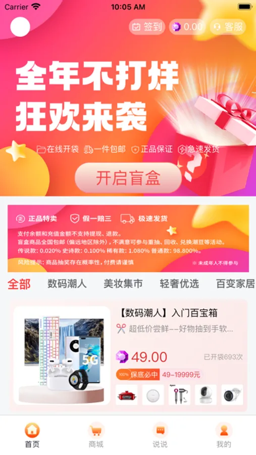 盲盒在线开盒,在家也能享受拆盒的乐趣,新潮盲盒包含海量热门数码产品、潮玩产品、品牌手机、热门IP手办、正品美妆、限量运动品牌等任你挑