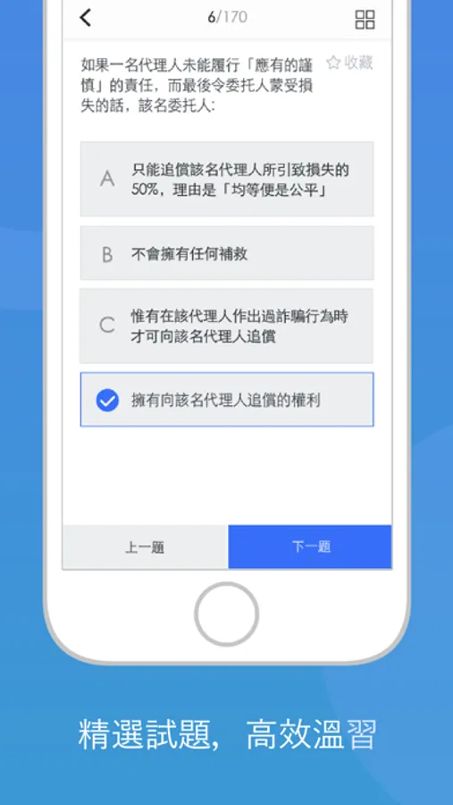 2. 收藏功能:考生可以選擇有需要針對練習的題目進行收藏,之後可以於收藏功能中強化練習。