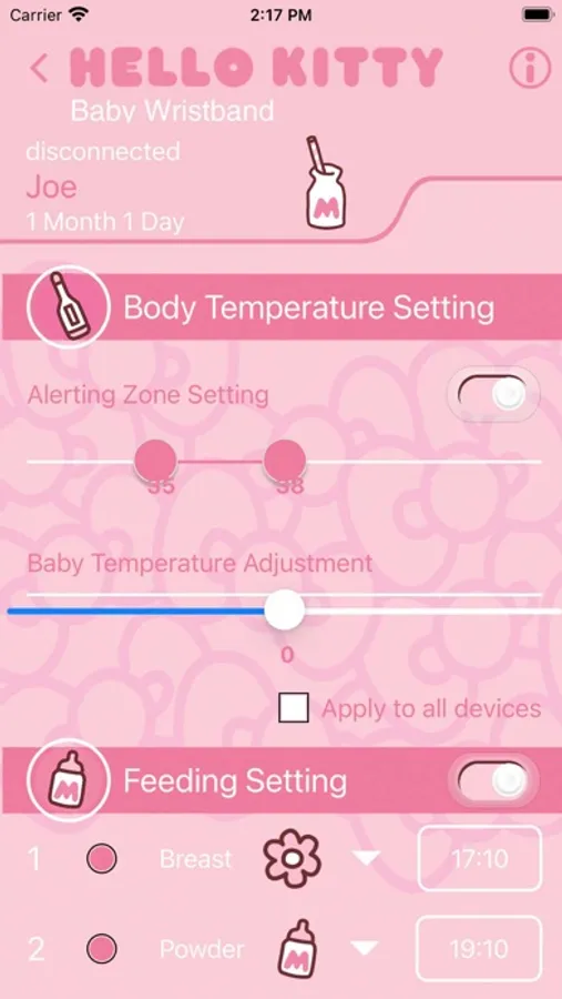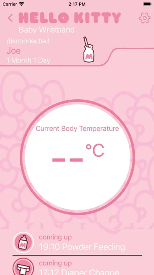 Hello Kitty Baby Wristband can monitor the baby temperature in every time. It can record the useful data by the app, such as body temperature and exercise period. If baby body temperature is too low/high, alert will be on automatically. The app also remind the parents the time to feed and change diaper.