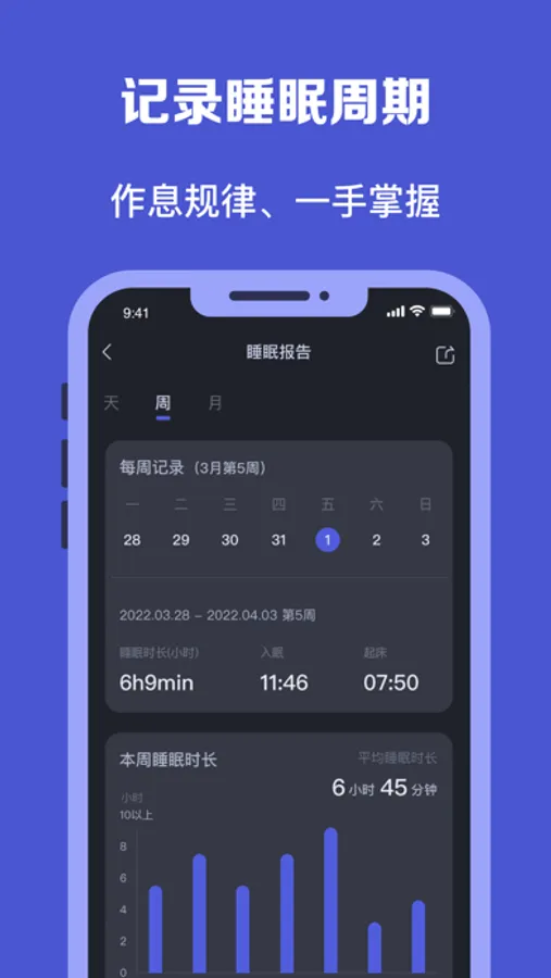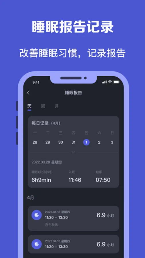 睡眠报告:帮您记录每日的睡眠报告,掌握自己的睡眠习惯,让您对自己的睡眠改善您的睡眠质量。
