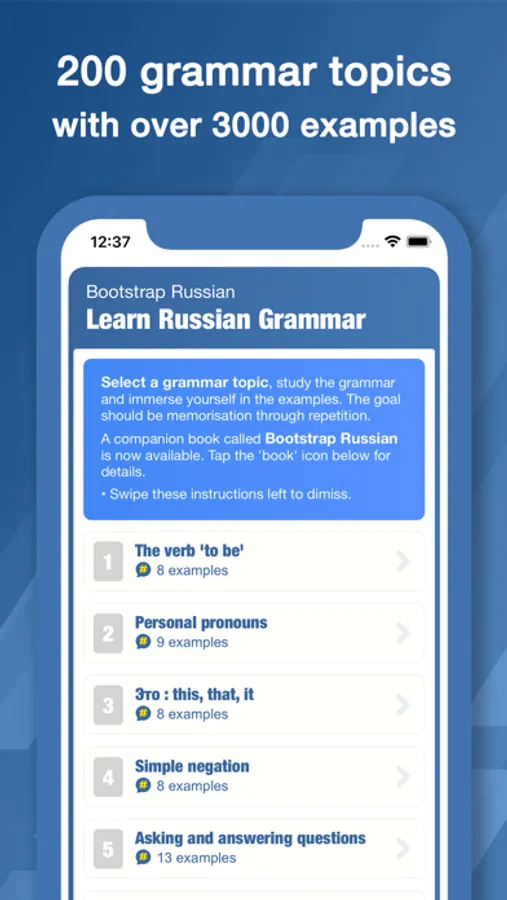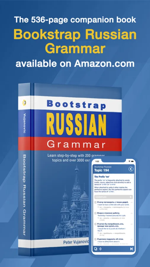 A companion BOOK is now available called "BootStrap Russian Grammar". The book contains all the content contained in this book - including 200 grammar topics and over 3000 example phrases.