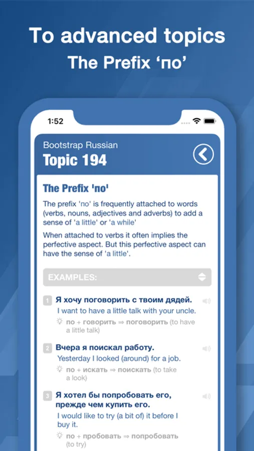 Each topic includes a thorough explanation of the grammar and then lots of examples that illustrate the grammar. Each example includes an English translation, as well as notes highlighting how each example illustrates that topic's grammar, as well as the meanings of new Russian words.