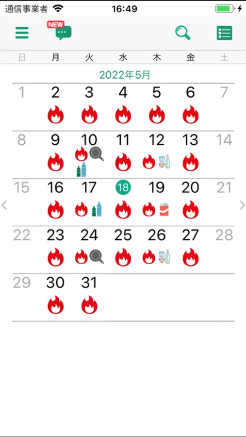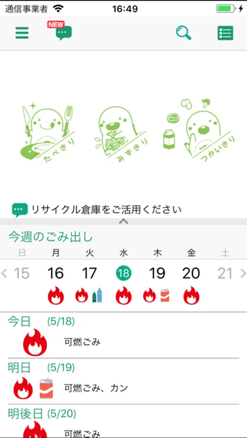 今日と明日、週ごと、月ごとの3パターンによるごみ収集日程を一つの画面ですぐに確認することができます。
