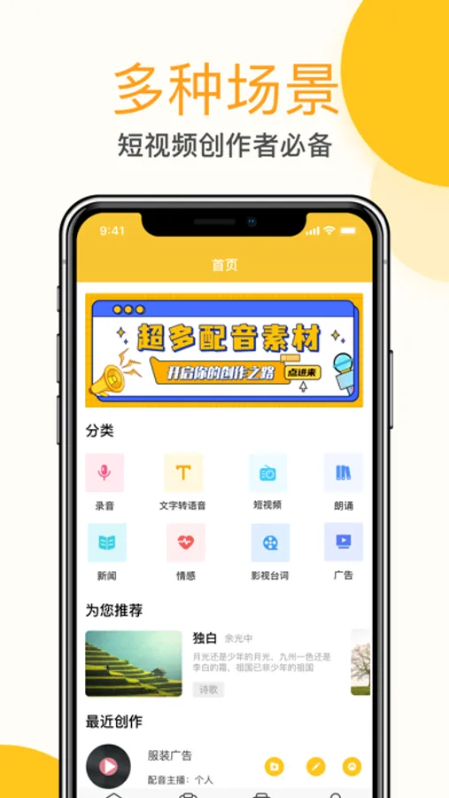 适用于自媒体短视频配音、企业商超广告配音、在线网课教育配音,操作简单。
