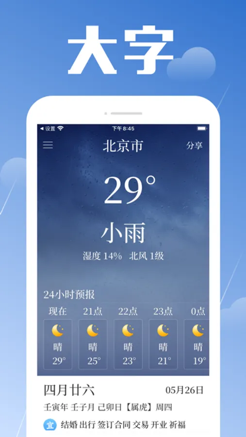 越来越多的中老年人视力下降看不清手机屏幕上的天气信息,无法及时了解天气变化。为此,我们在方知天气预报的基础上开发了一款为视力下降的中老年人研发的天气app。