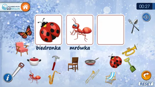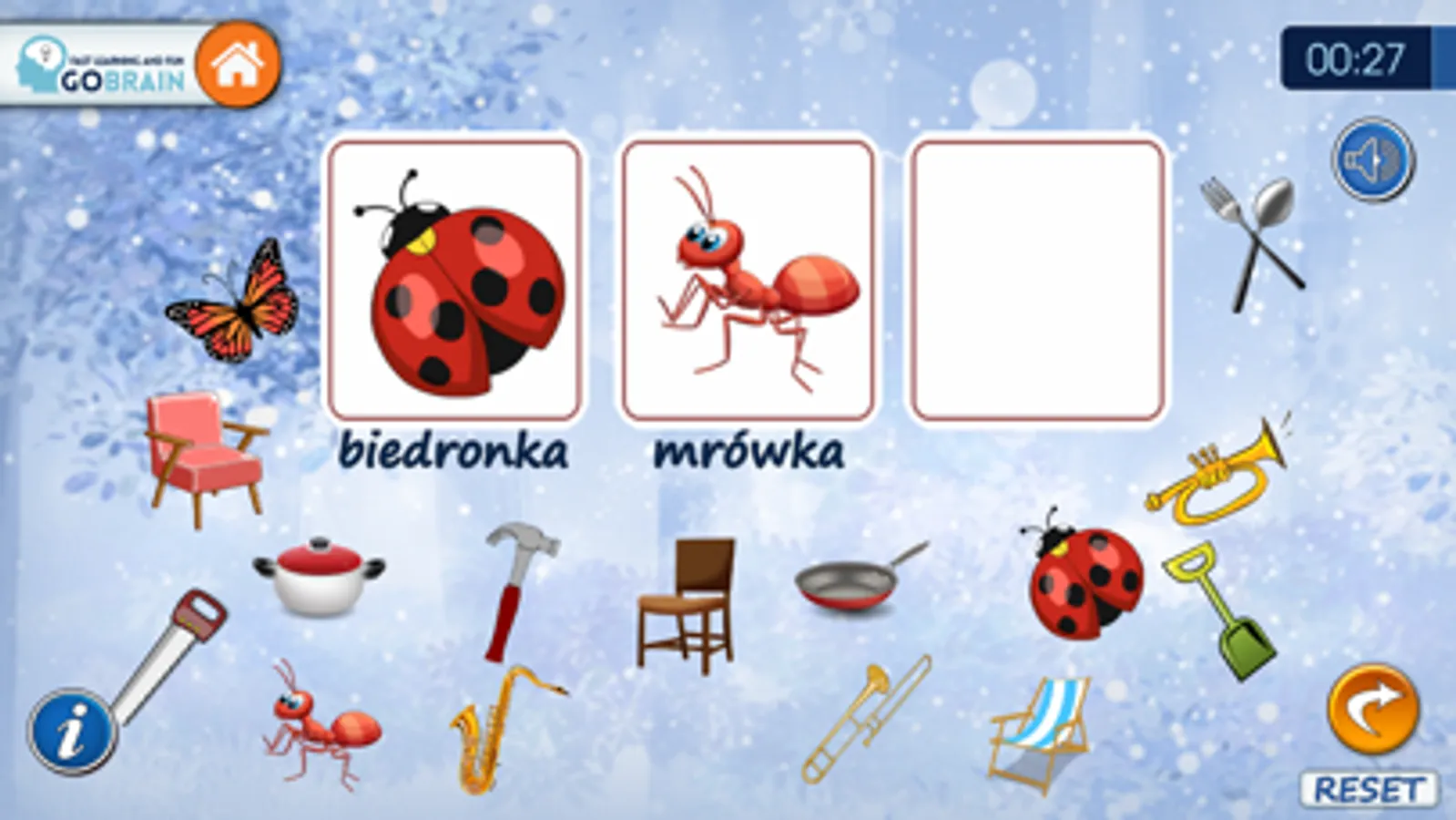 Dzięki naszej aplikacji dziecko nauczy się koncentrować na zadaniu, poprawi swoją pamięć, nauczy się nazw kolorów, kształtów, umiejętności segregowania przedmiotów według kategorii, rozpoznawania odgłosów zwierząt, ćwiczy pamięć sekwencyjną.