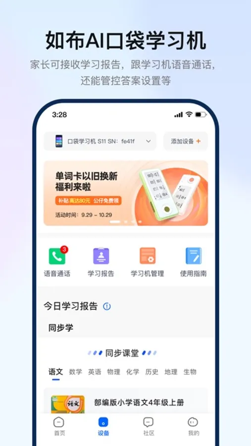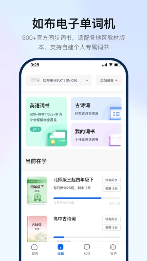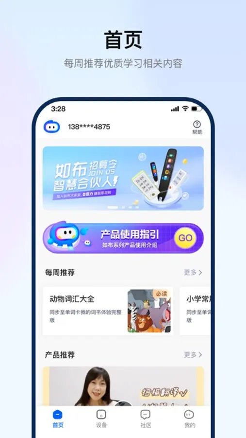 如布智能硬件APP是专为如布科技旗下智能硬件产品开发的APP,帮助用户绑定购买的电子单词机,AI口袋学习机等智能硬件设备,辅助完成相应的任务设置等操作。