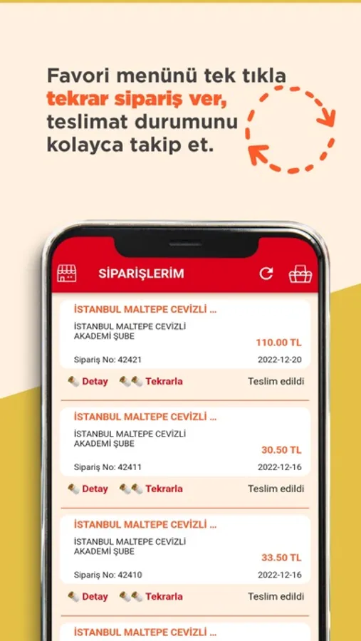 Sevdiğiniz tatları yeniden sepet oluşturmadan “sipariş tekrarla” özelliği sayesinde tek tık ile satın alabilirsiniz.