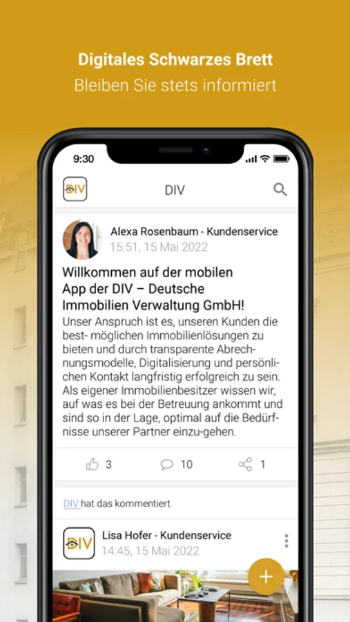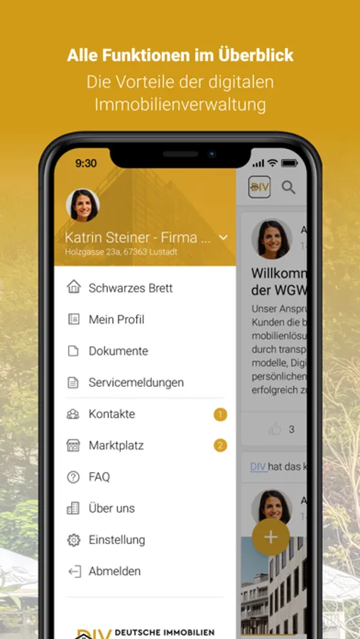 Als Kunde der DIV – Deutsche Immobilien Verwaltung GmbH profitieren Sie von einem besonders innovativen Kundenservice, der Ihnen viele Freiheiten bietet und sich ständig weiterentwickelt. Mit der DIV App können Sie uns bequem rund um die Uhr Anliegen und Schäden inklusive Fotodokumentation per Smartphone melden. Zusätzlich stellen wir Ihnen eine digitale Dokumentenmappe mit wichtigen Dokumenten für Ihre Immobilie(n) zur Verfügung. Über das digitale schwarze Brett informieren wir Sie via Push-Nachricht proaktiv und auf kürzestem Weg über wichtige Informationen rund um die uns anvertrauten Immobilien.