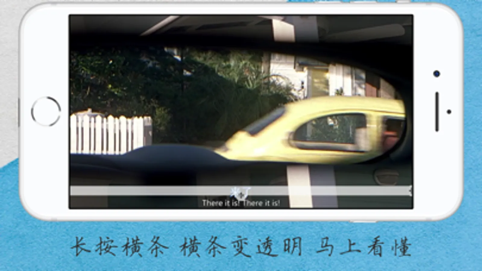 在您没看到当前这句英文字幕是什么意思的时候,只需要按住这个小色块,即可看到被挡住的中文字幕,了解当前英文的含义。