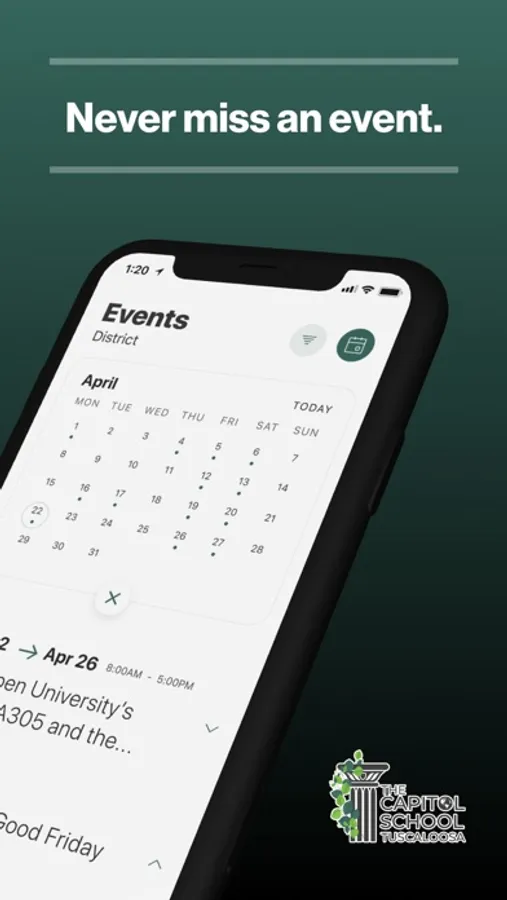 The event section shows a list of events throughout the district. Users can add an event to their calendar to share the event with friends and family with one tap.