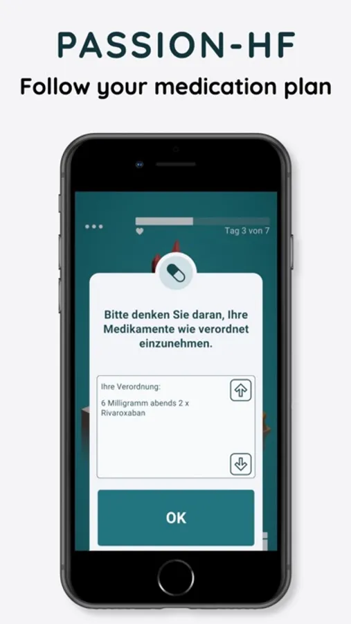 PASSION-HF is a gamified application enabling self-care of chronic heart failure and tracking and monitoring of medication intake adherence. A visual storytelling application progressing as long as the user adheres to the medication plan. Track your progress with the help of a calendar and the visual cues of the virtual cues. Consult Dr.Me if an intake was skipped and progress further in the visual storytelling.