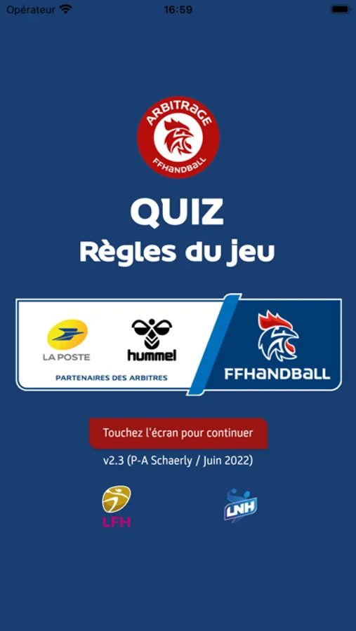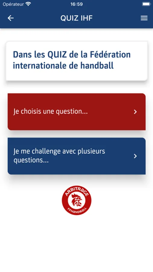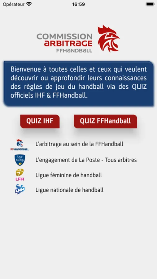 Cette application est destinée à toutes celles et ceux qui veulent découvrir ou approfondir leurs connaissances des règles de jeu du handball au travers de QUIZ officiels rédigés par la Fédération internationale de handball et la Fédération française de handball.