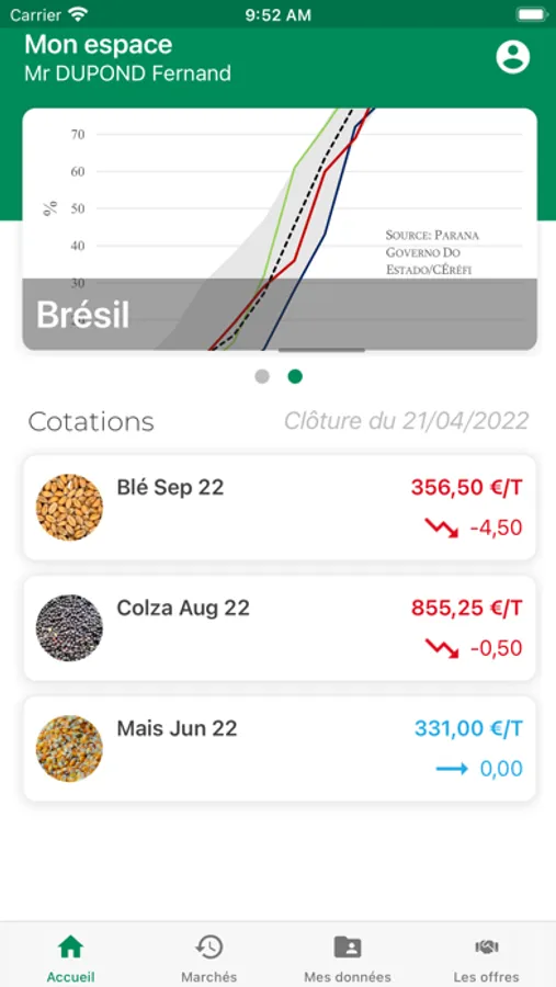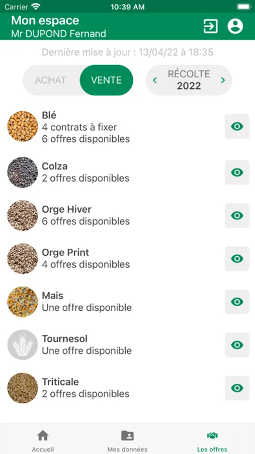 - l’affichage des offres de prix pour vos céréales et oléo protéagineux avec possibilité de réaliser vos contrats