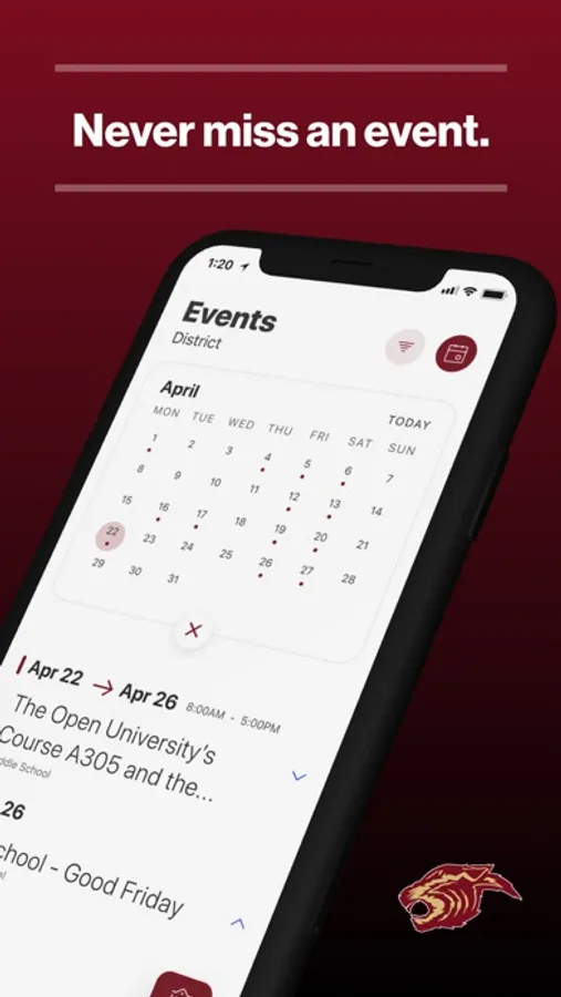 The event section shows a list of events throughout the district. Users can add an event to their calendar to share the event with friends and family with one tap.