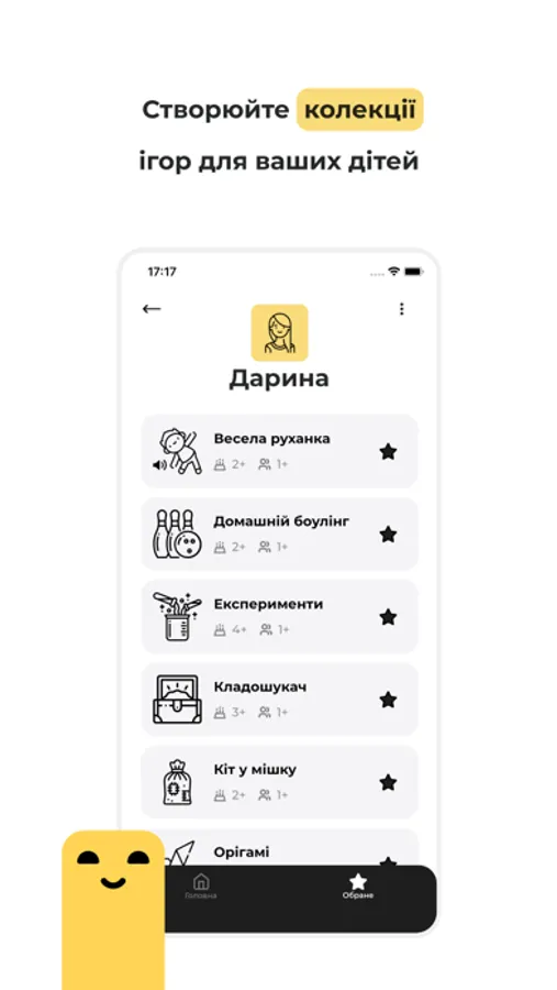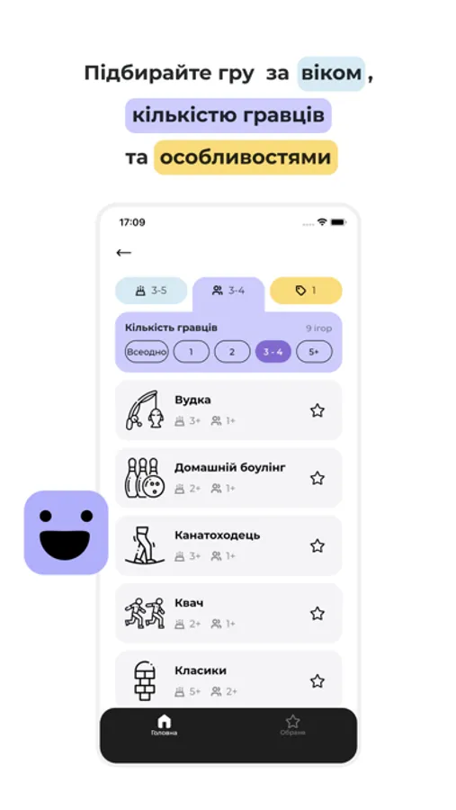 Колекція ігор містить докладні інструкції, малюнки, відео. У програмі легко відсортувати ігри за віком, кількістю гравців, простором та навичками. Ви також можете створити свою колекцію улюблених ігор та спланувати веселе свято.