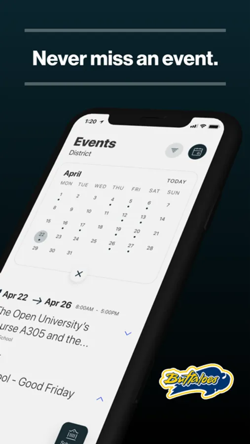 The event section shows a list of events throughout the district. Users can add an event to their calendar to share the event with friends and family with one tap.