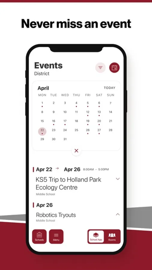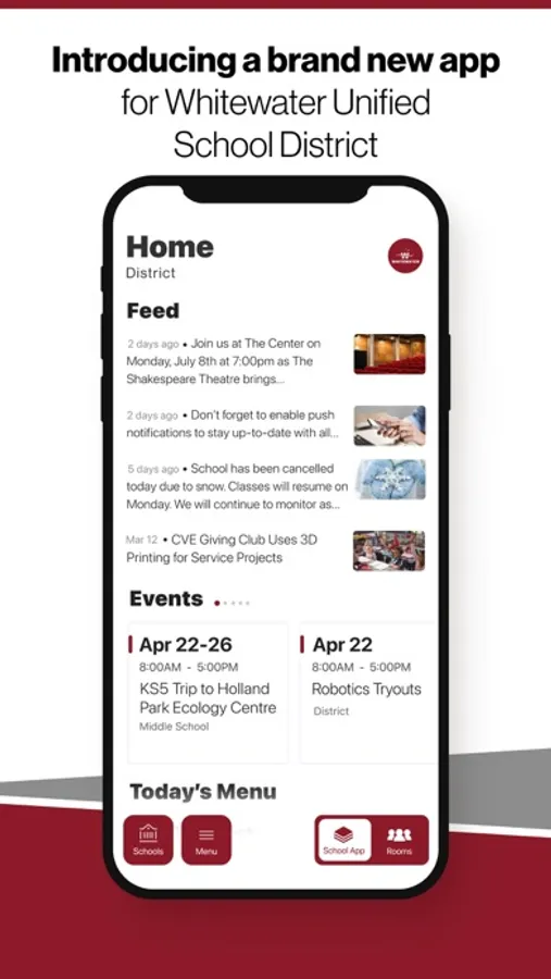 The event section shows a list of events throughout the district. Users can add an event to their calendar to share the event with friends and family with one tap.