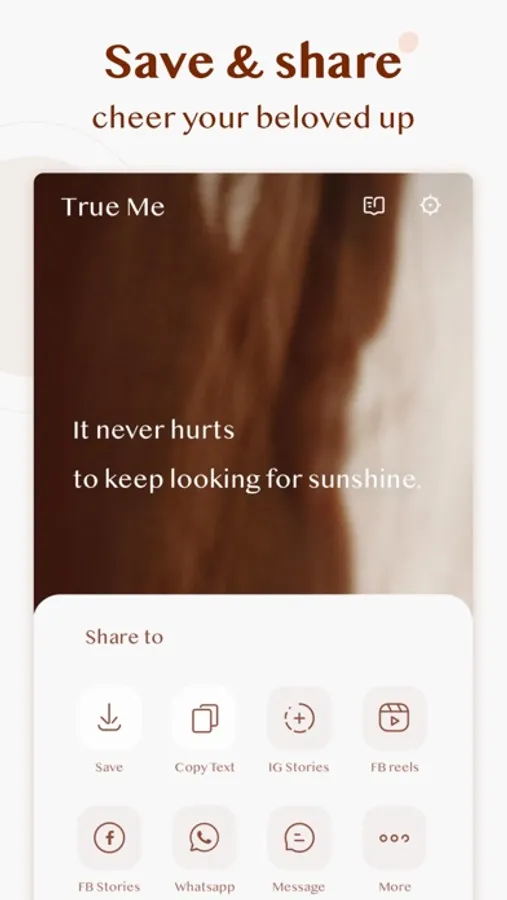 Also try making quotes in TrueMeCalm, and sharing them with your beloved ones or as IG stories to cheer your followers up. With our customizable background videos and fonts, it’s easy to make your inspirational videos unique and exclusive.