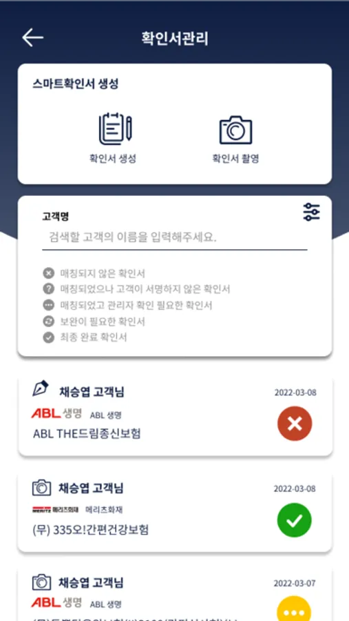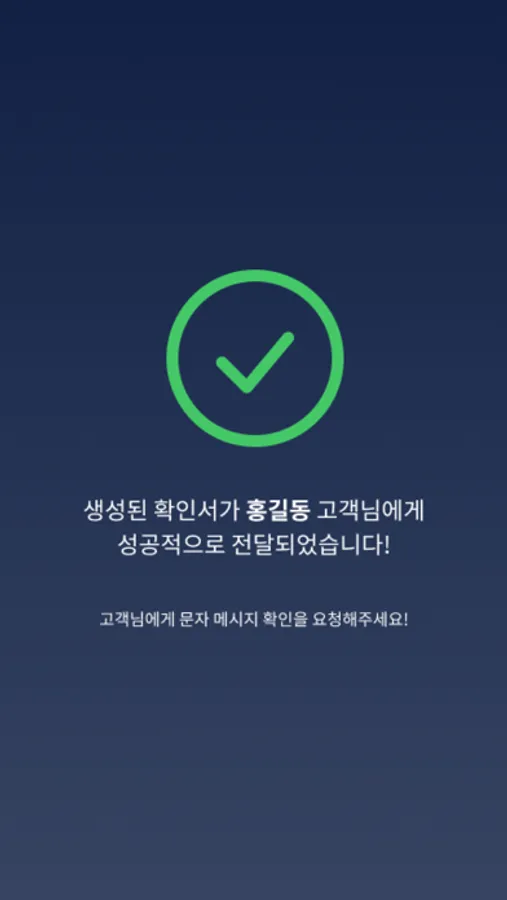 - 스마트확인서를 생성/수정/확인하고 고객에게 문자로 서명을 요청할 수 있습니다.