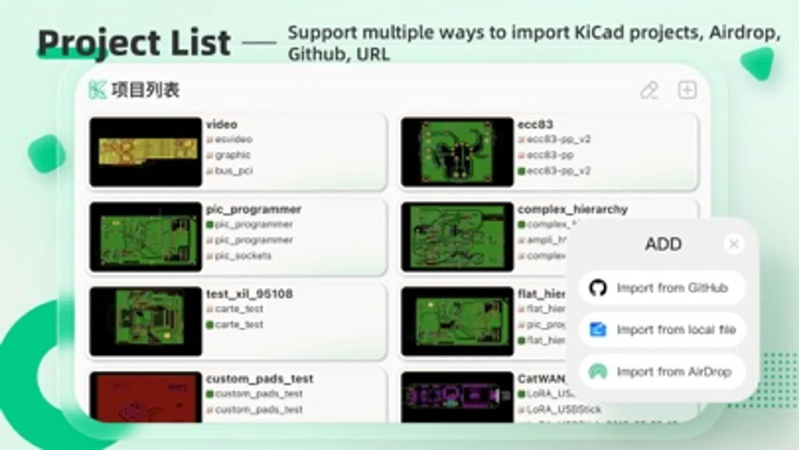 * Project List: KiCad's project manager to import by zip file, and list project file to open