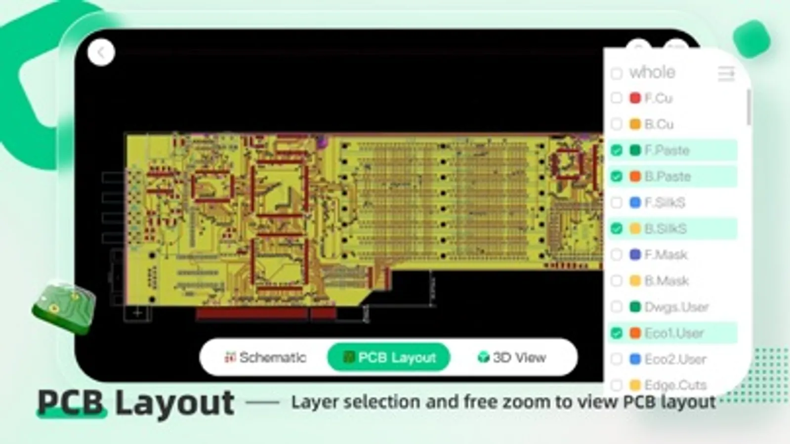 * PCB Viewer: KiCad's PCB layout viewer allow easy inspection of your PCB, and filter by layer.
