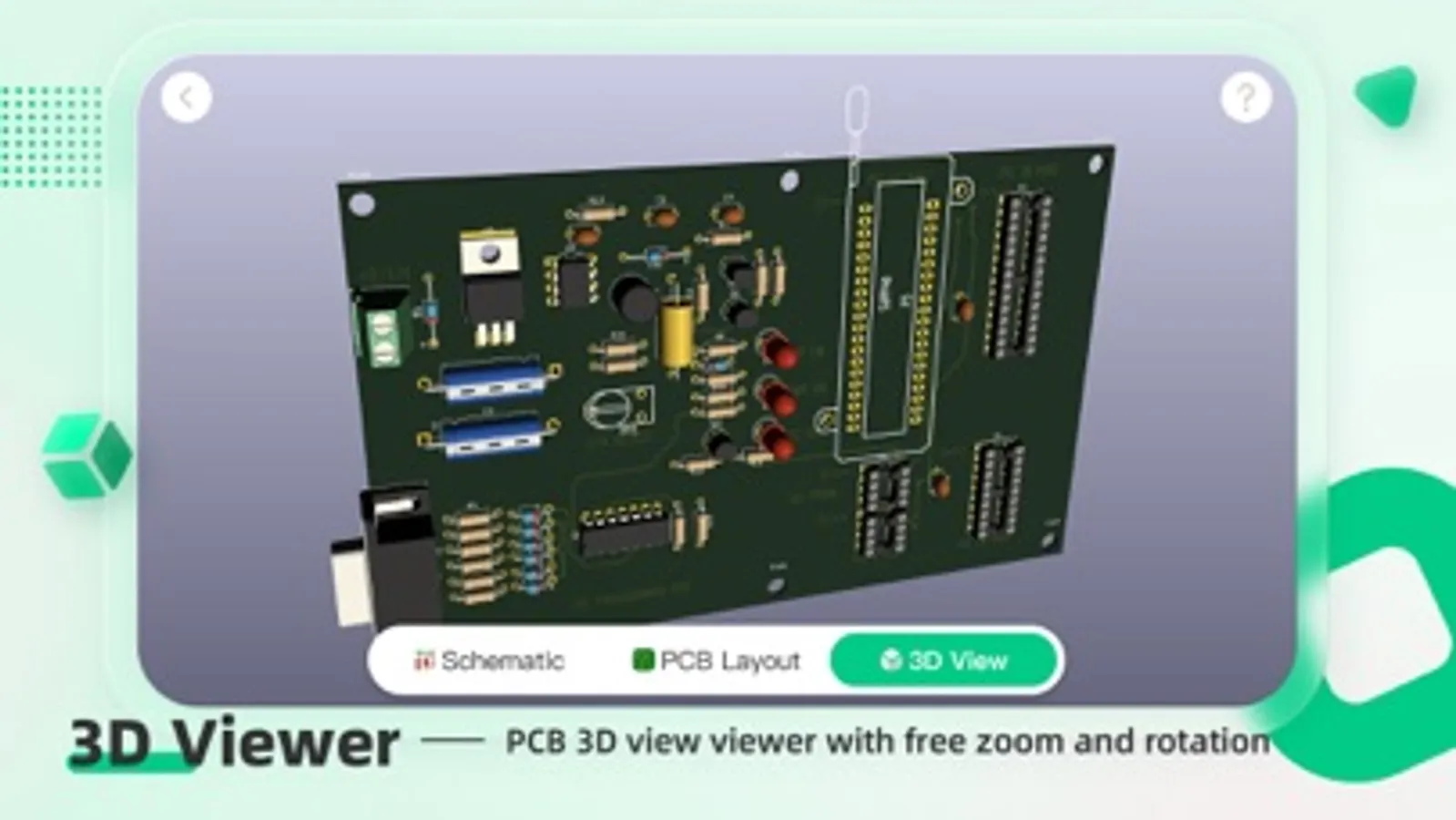 * 3D Viewer: KiCad's 3D Viewer allows easy inspection of your PCB to check mechanical fit and to preview your finished product. A built-in raytracer with customizable lighting can create realistic images to show off your work.4.3D Viewer: KiCad's 3D Viewer allows easy inspection of your PCB to check mechanical fit and to preview your finished product. A built-in raytracer with customizable lighting can create realistic images to show off your work.