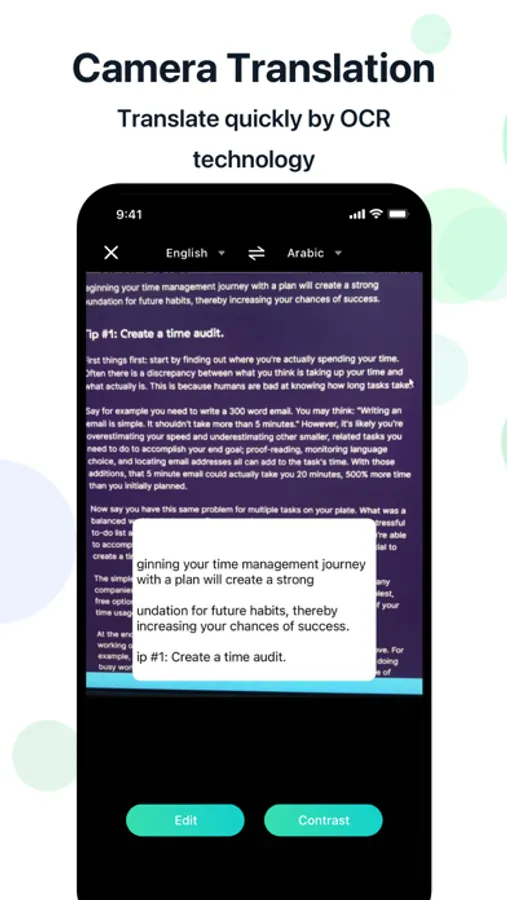 Translate any pic or text using your camera. Easily translate menus, signs, or any paper document.