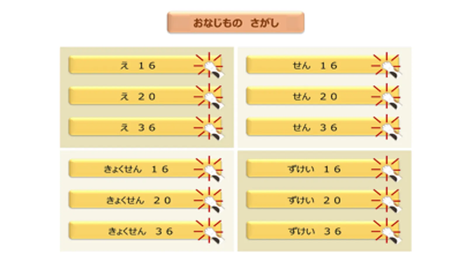 「え」は具体的な視覚刺激(絵)のマッチングの課題、「せん」「きょくせん」
