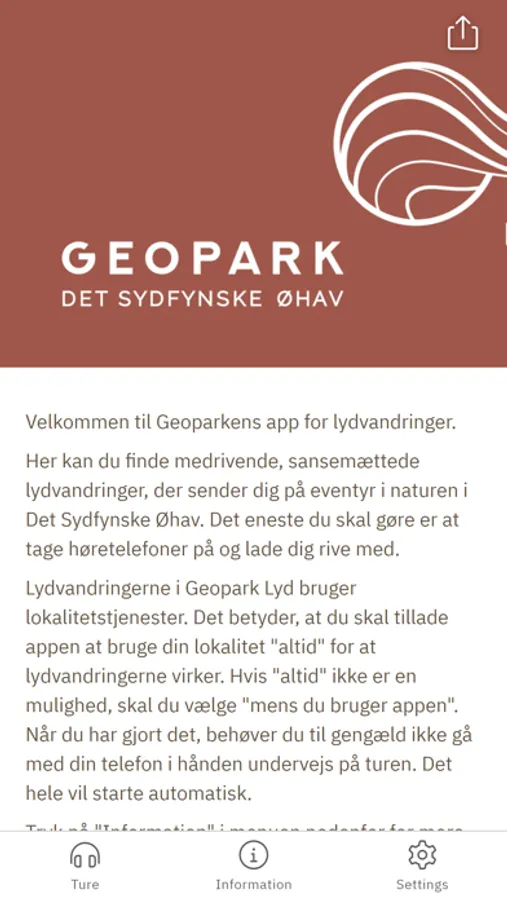 Geopark Lyd er Geopark Det Sydfynske Øhavs app for lydvandringer i Det Sydfynske Øhav. Fyldt med medrivende, sanselige lydfortællinger skræddersyet til det landskab der vandres i. Det eneste du skal gøre, er at tage høretelefoner på og lade dig rive med. Intet andet.