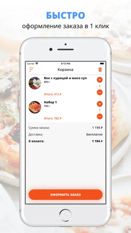Скачивайте наше приложение, оформляйте заказ и наслаждайтесь любимой едой, где бы Вы ни были! Приятного аппетита!