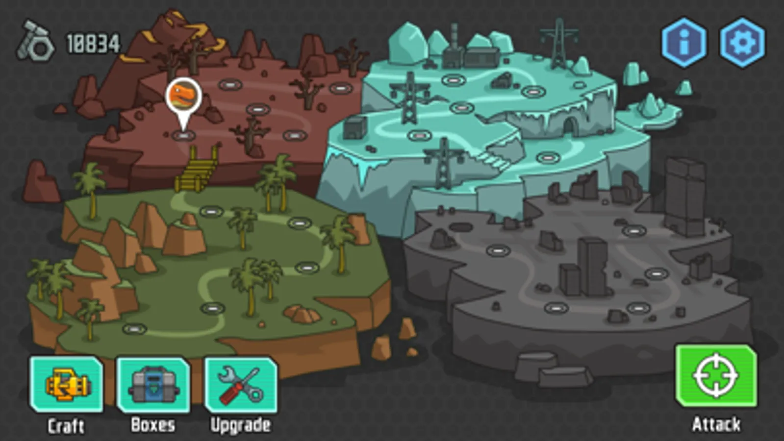 The first thing you’ll do in CyberDino is attack. In attack mode, you roam through a series of battles against robots. You have 3 abilities to use with your default attack. There are 4 separate regions, each new place bringing tougher enemies, and a final boss at the end.