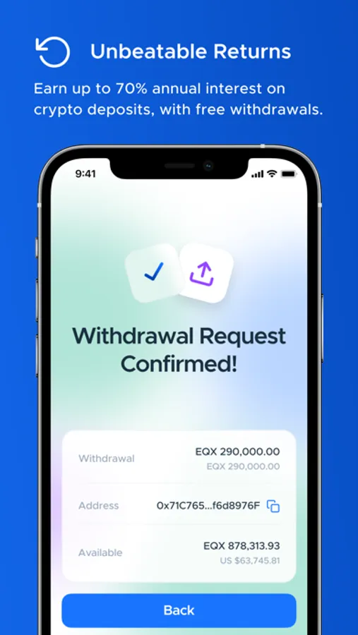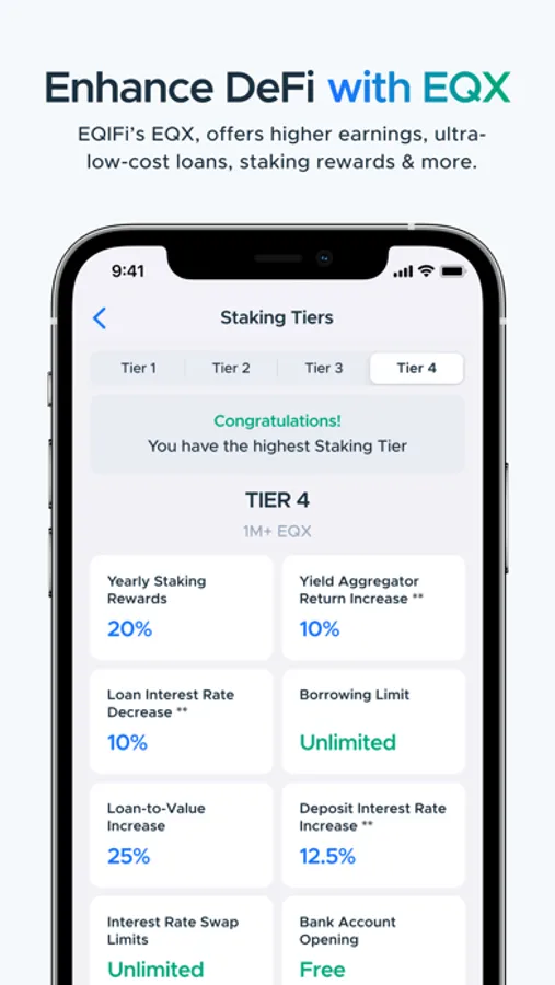 With the EQIFi App, you can put your money to work and earn more EQX tokens every day. The EQX token offers holders a unique opportunity to increase their earning potential with ultra-low-cost loans and staking rewards. When you download the app and create an account, you'll be able to see all of the features and benefits that EQX has to offer. So get started today to earn up to 20% staking rewards and see how all the other EQIFi products can offer more.